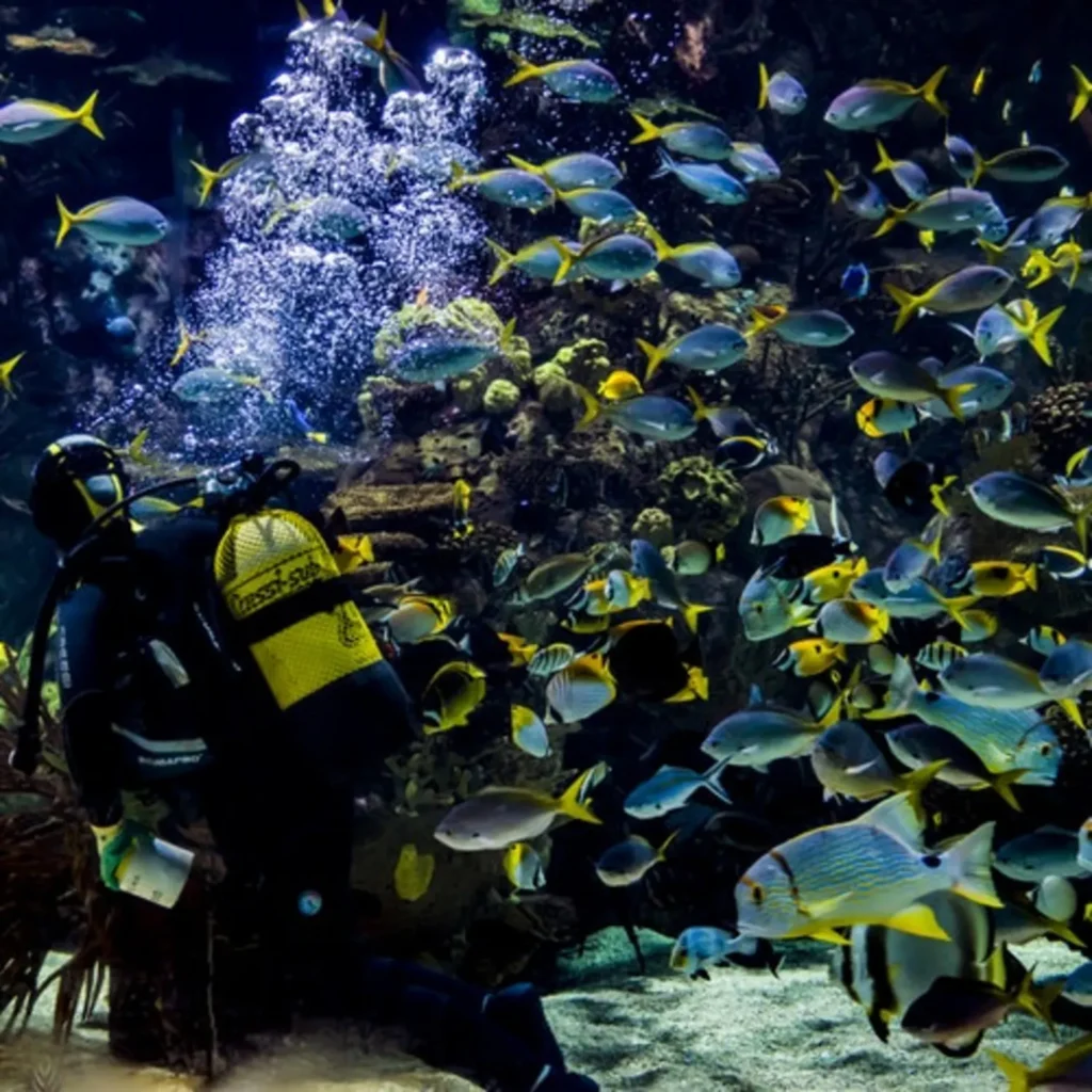 Descubra un inmenso acuario que alberga delfines, tiburones, pingüinos, cocodrilos y mucho más.